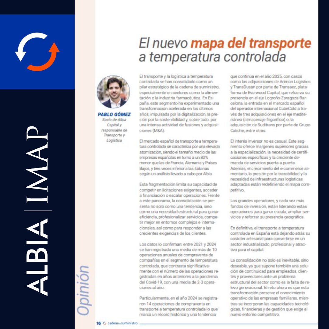 In an interview with the magazine Cadena de Suministro, Pablo Gómez, Partner at Albia IMAP, analyzes how this segment has moved in just a few years from being highly fragmented to becoming a focus of attraction for investors and international funds, driven by the strong momentum of Mergers and Acquisitions (M&A).