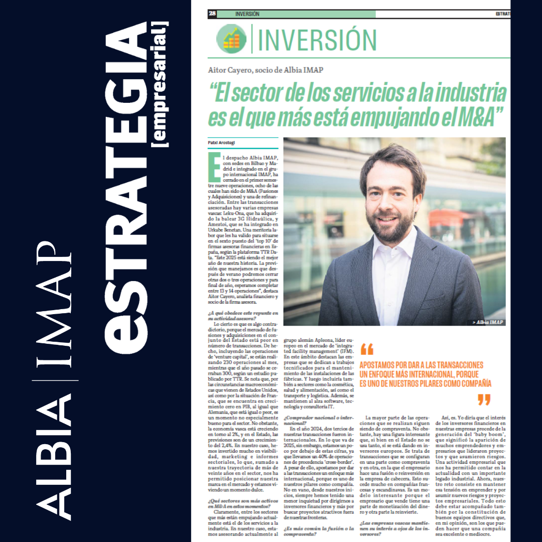 Hace unos días nos visitó Patxi Arostegi, de la publicación Estrategia Empresarial, para charlar con Aitor Cayero, socio de Albia, y hacer una valoración del primer semestre de 2025 en el mundo de las fusiones y adquisiciones desde nuestro punto de vista.
