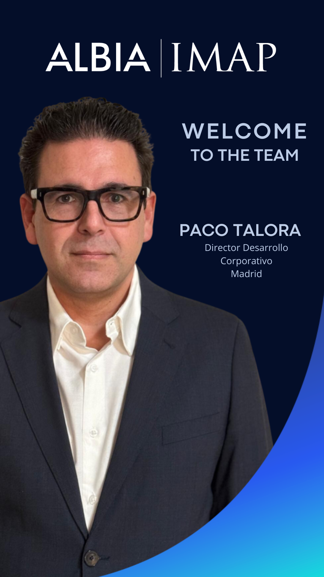 Albia IMAP comunica la incorporación de Paco Talora como Director de Desarrollo Corporativo, con el propósito de fortalecer su equipo en Madrid y seguir consolidando su liderazgo como compañía experta en fusiones y adquisiciones.